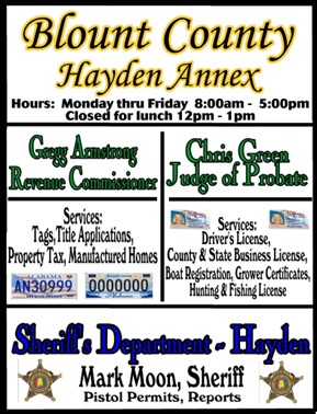 The Blount County Revenue Commissioner’s Representatives at the Hayden Satellite Office are available to assist customers with Motor Vehicle Tags, Title Applications, Manufactured Home Registrations and Decal Renewals, Property Tax Payments, and Property Tax Exemption Claims.